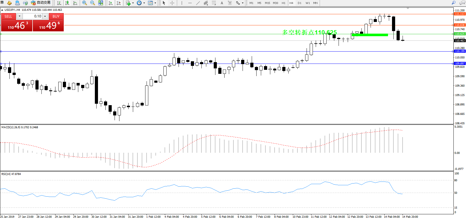 交易策略:110.625下方看跌,目标110.199、109.897