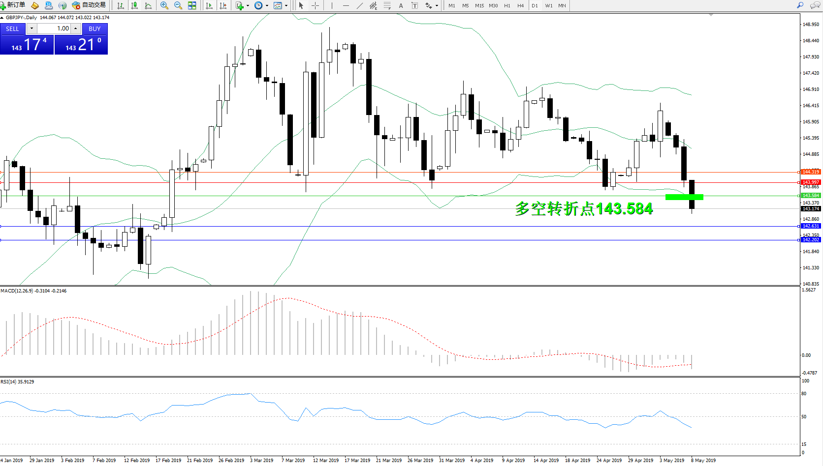 交易策略:143.584下方看跌,目标142.631143.202