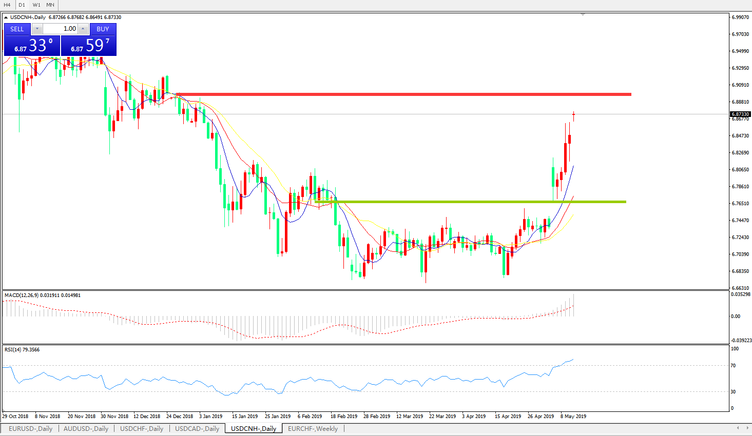 交易策略: 在6.7560之上,看涨,目标价位为6.8585,然后为6.9200。