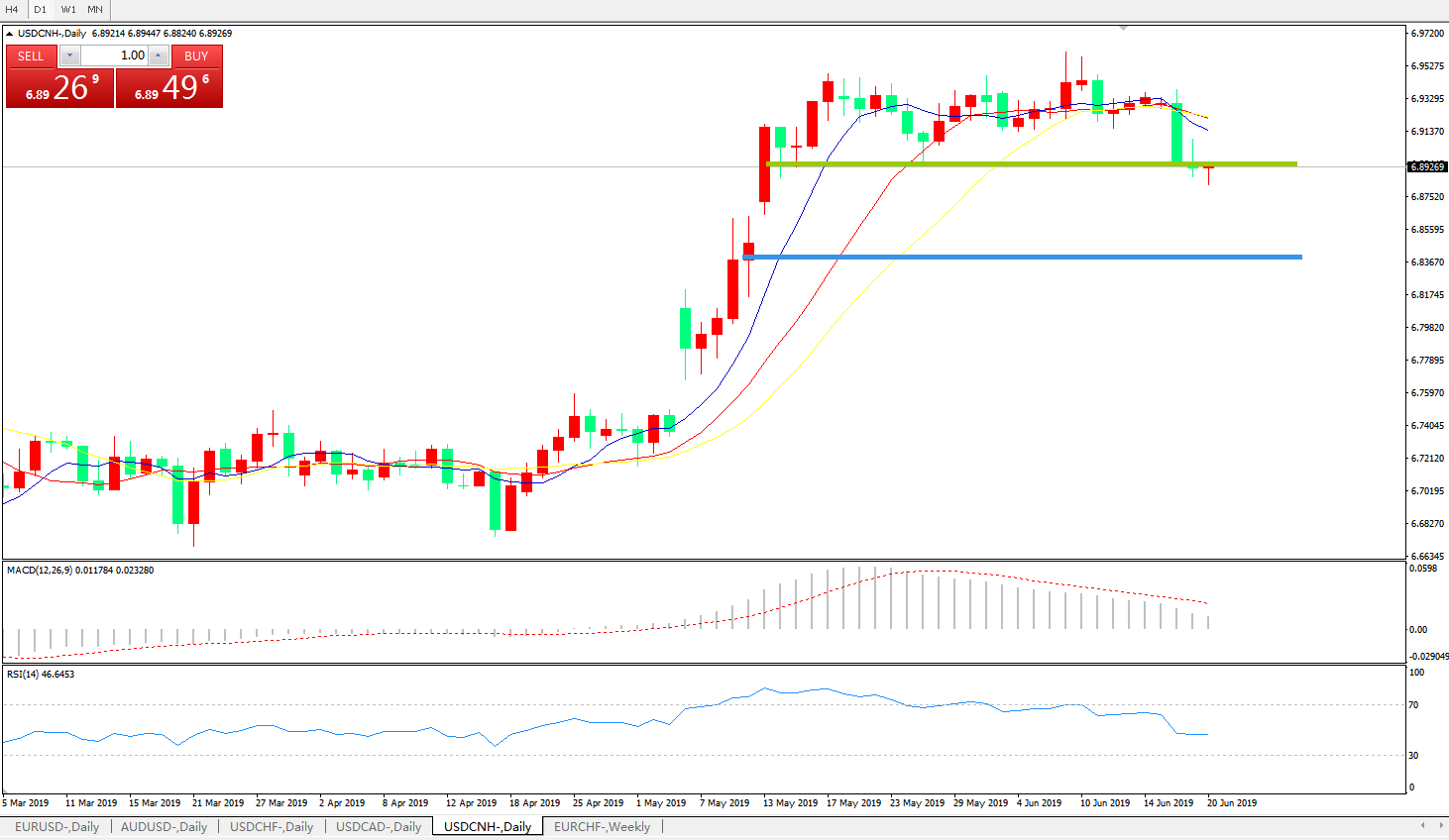 技术面简析:日线均线有发散下行迹象MACD0轴上方向下运行且动能柱持续缩量RSI逐步走低,预计短期汇价有继续回落需求,贸易争端缓解及G20是目前焦点,需持续关注