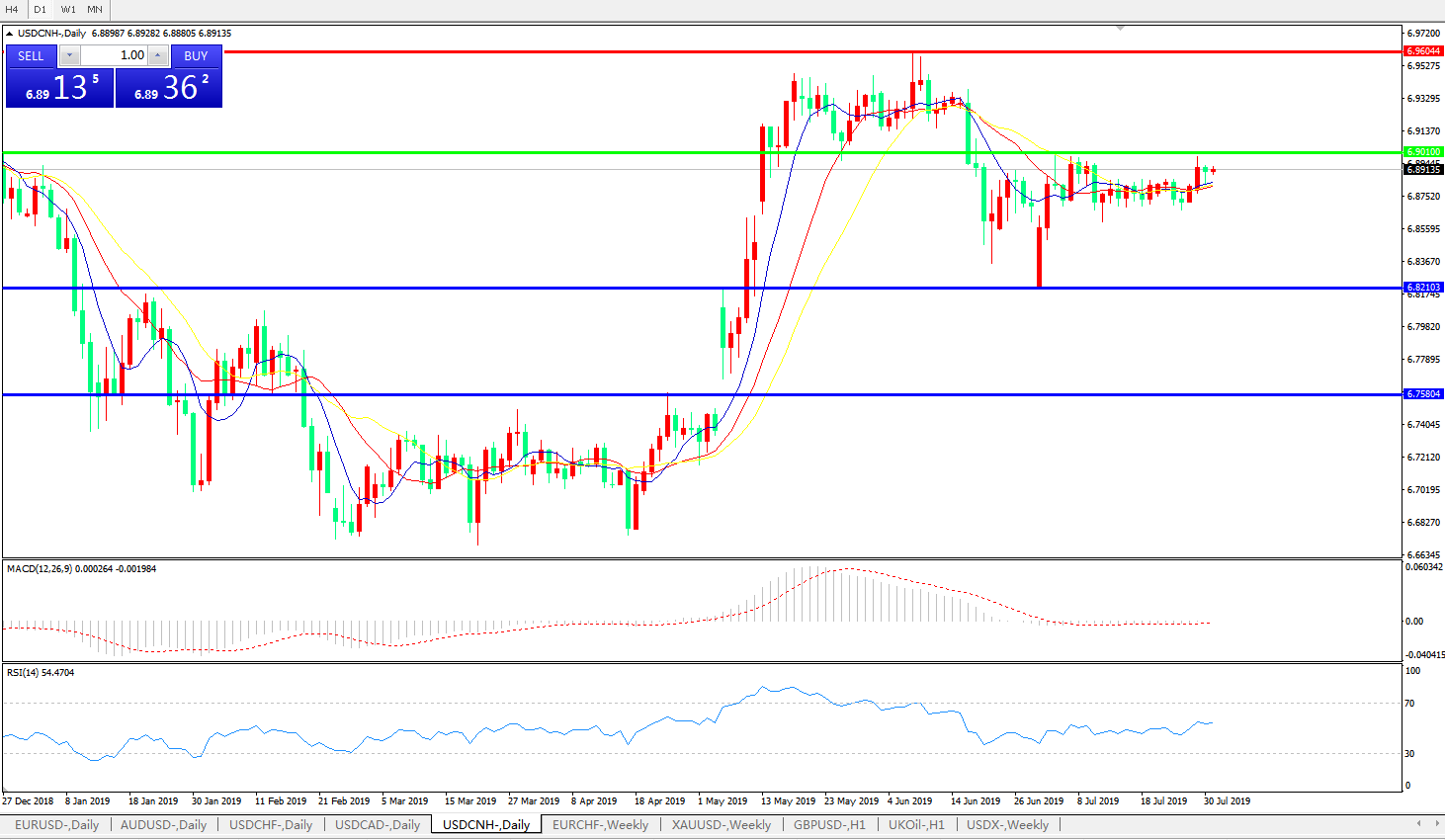 技术面简析:日图均线再度粘合无方向,MACD徘徊在0轴附近且动能柱无量能,RSI维持震荡,汇价持续整理无方向选择,预计短期汇价将继续整理修正,中期关注6.9010附近多空转折区域压制是否有效及中美贸易谈判最新进展。