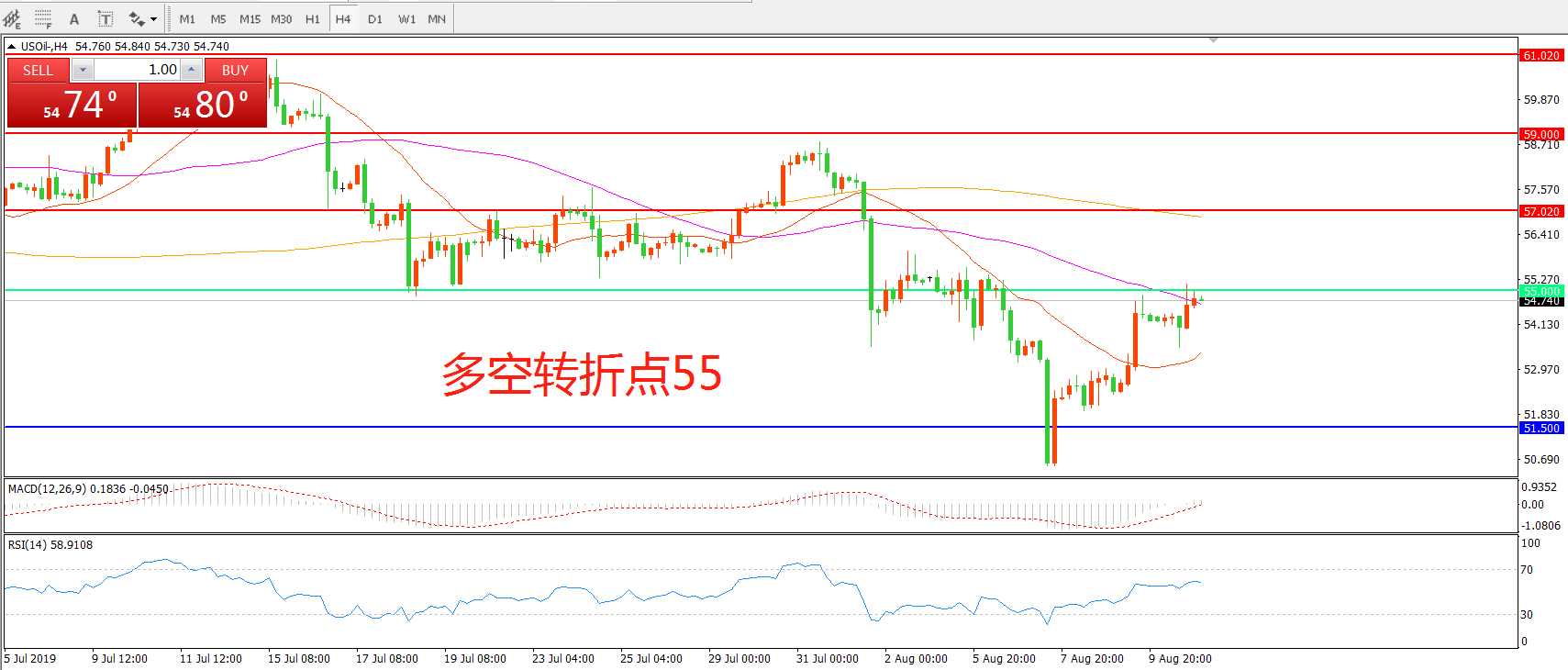 4小时图看,油价大跌后震荡回升,短期反弹力度较强,55周期均线附近成为短线争夺焦点,MACD绿柱减少,红柱增加 RSI指标走平,日内延续震荡概率较大。