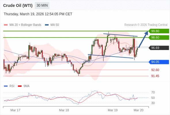 在 94.05 之上,看涨,目标价位为 98.60 ,然后为 99.80 。