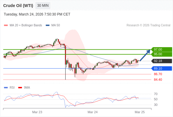 美国原油 (WTI) 期货 (K6) 当日内: 目标位为92.60。