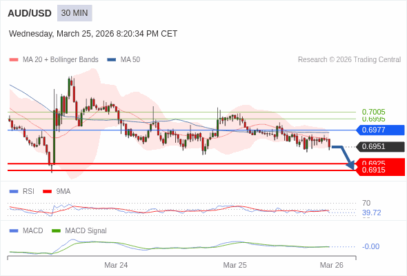 澳元/美元 当日内 : 看跌,在 0.6977 之下。