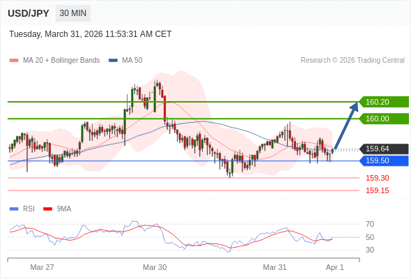 在 159.50 之上,看涨,目标价位为 160.00 ,然后为 160.20 。