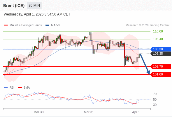 布伦特原油 (ICE) (M6) 当日内: 短期关键阻力位在106.30。
