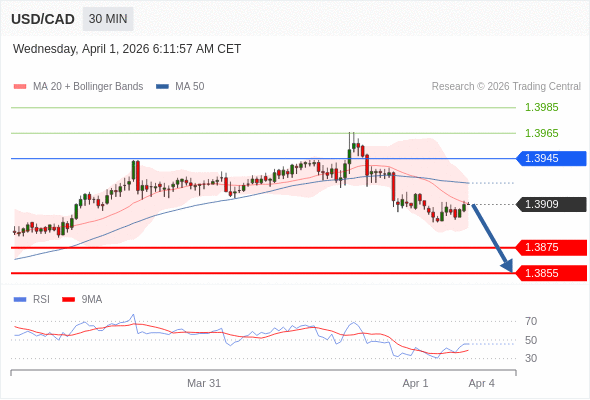 在 1.3945 之下,看跌,目标价位为 1.3875 ,然后为 1.3855 。