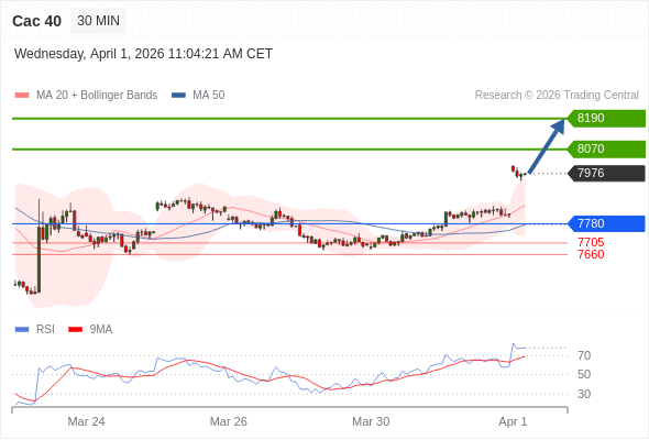 Cac 40 当日内: 在7780之上,看涨。