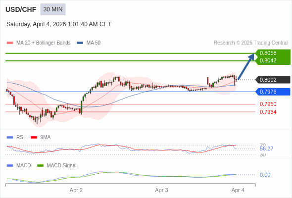美元/瑞郎 当日内 : 看涨,当 0.7976 为支撑位。