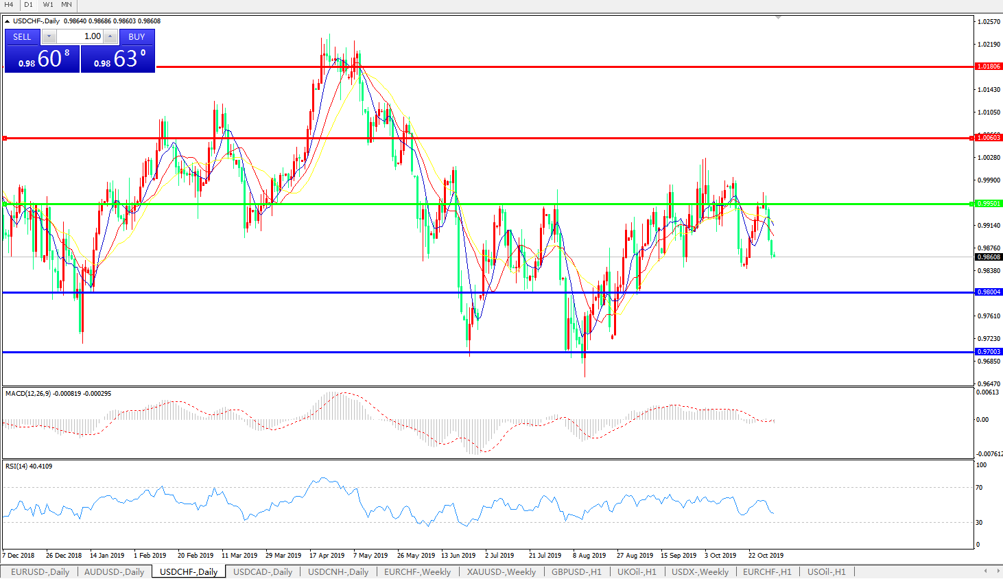 技术面简析:日线图均线呈下行态势,汇价再度大幅下行,MACD运行于0轴附近量能几无,RSI再度下行,预计汇价将进一步下行。