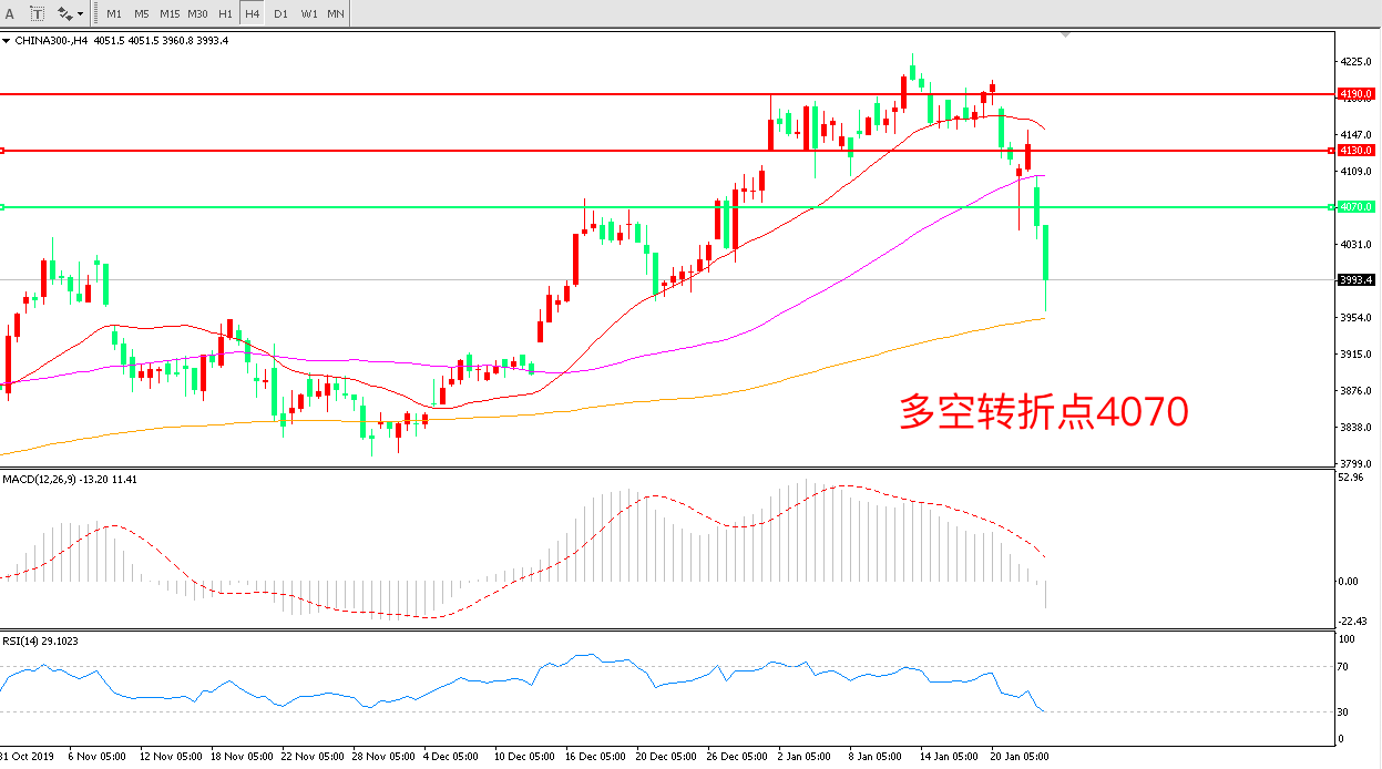 4小时图看, 沪深300长阴下破整体涨势被破坏23日节前最后一个交易日,节后关注是否有跳空,再行定夺