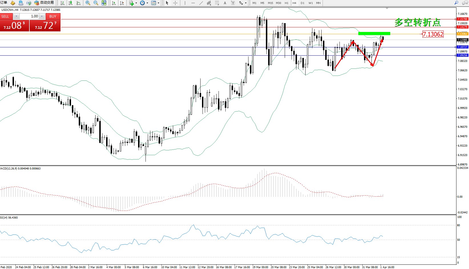 交易策略:7.13062下方看跌,目标7.10727、7.09256