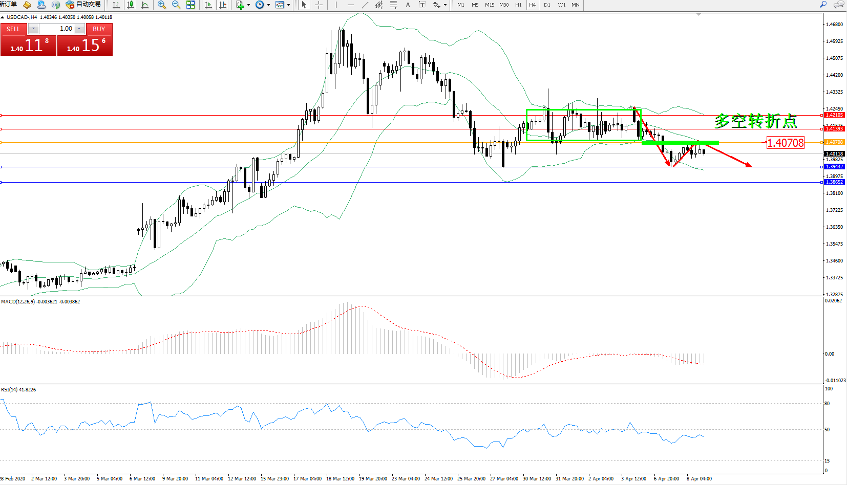 交易策略:1.40708下方看跌,目标1.39442、1.38652