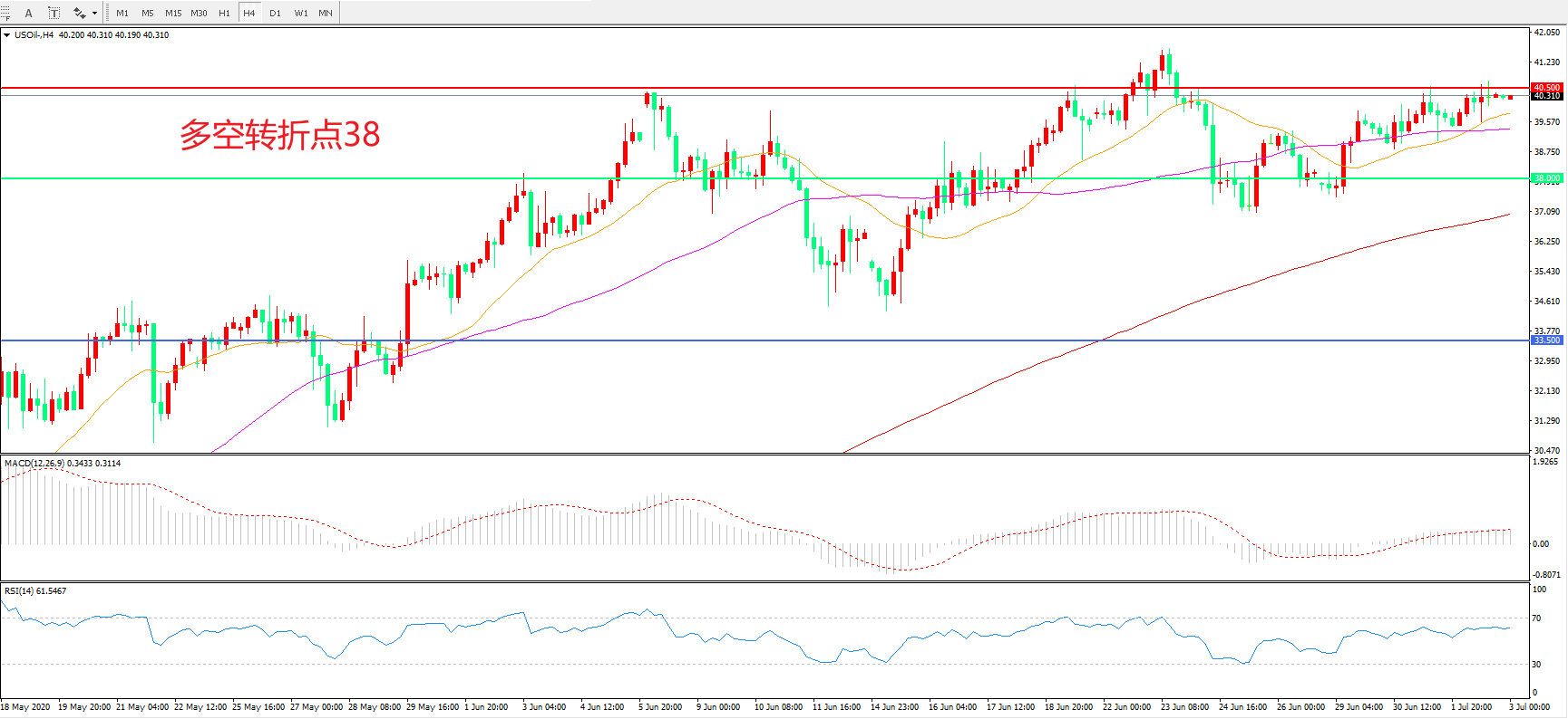 4小时图看,油价延续高位震荡,真题波幅不大,55周期均线成为短期支撑,40.50成为短期阻力,MACD红柱增加,RSI指标走平,日内延续震荡概率较大。