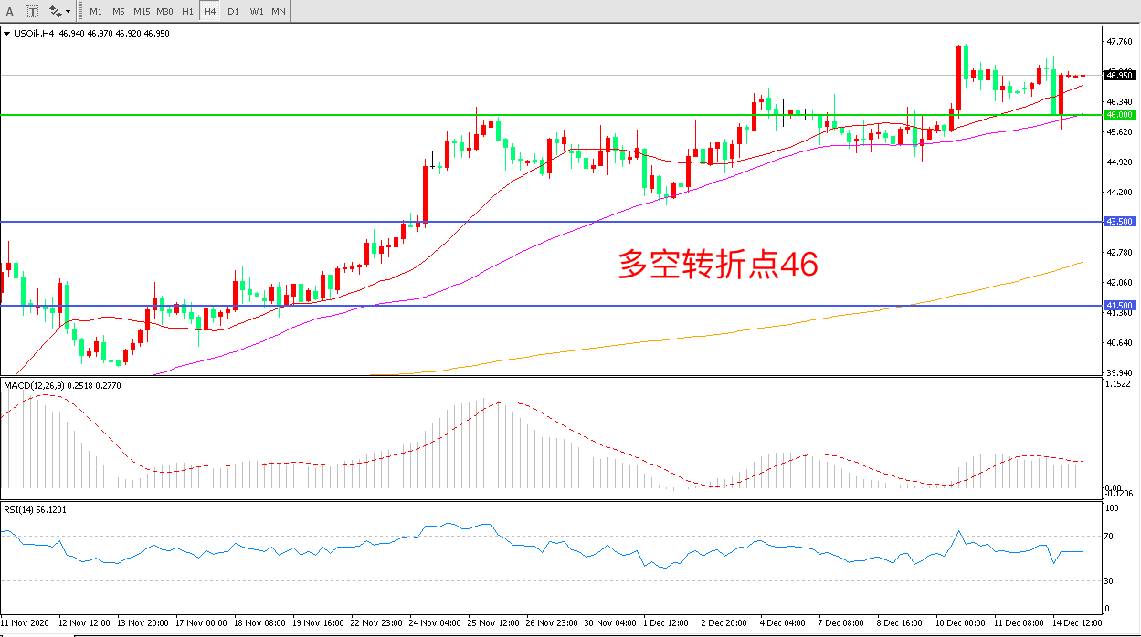周一(12月14日),疫苗接种形势提振需求前景,油价涨超1%,但OPEC再度削减今明两年全球石油需求预期令市场情绪再度承压,美国WTI原油延续高位震荡,收报46.94美元/桶,目前来看,原油多头的韧性依然比较强。