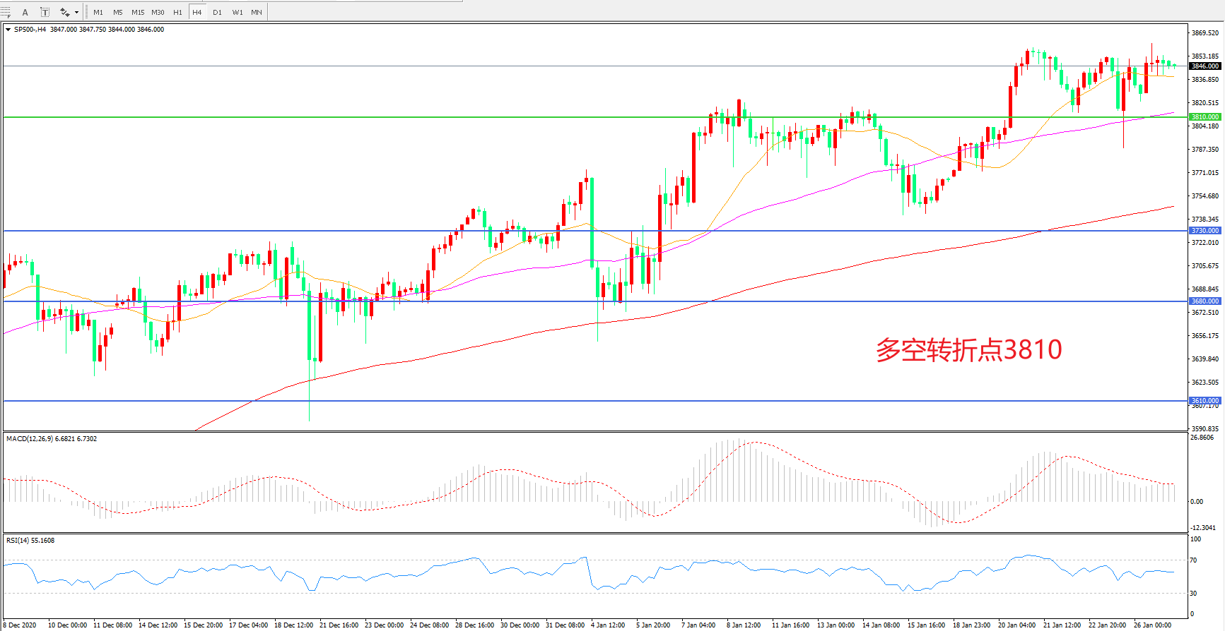 4小时图看,标普500长阳拉升后小幅回落,上行趋势暂缓,21周期均线成为下方支撑,3900成为上方阻力,MACD红柱缩短,RSI指标走平,日内延续震荡概率较大。
