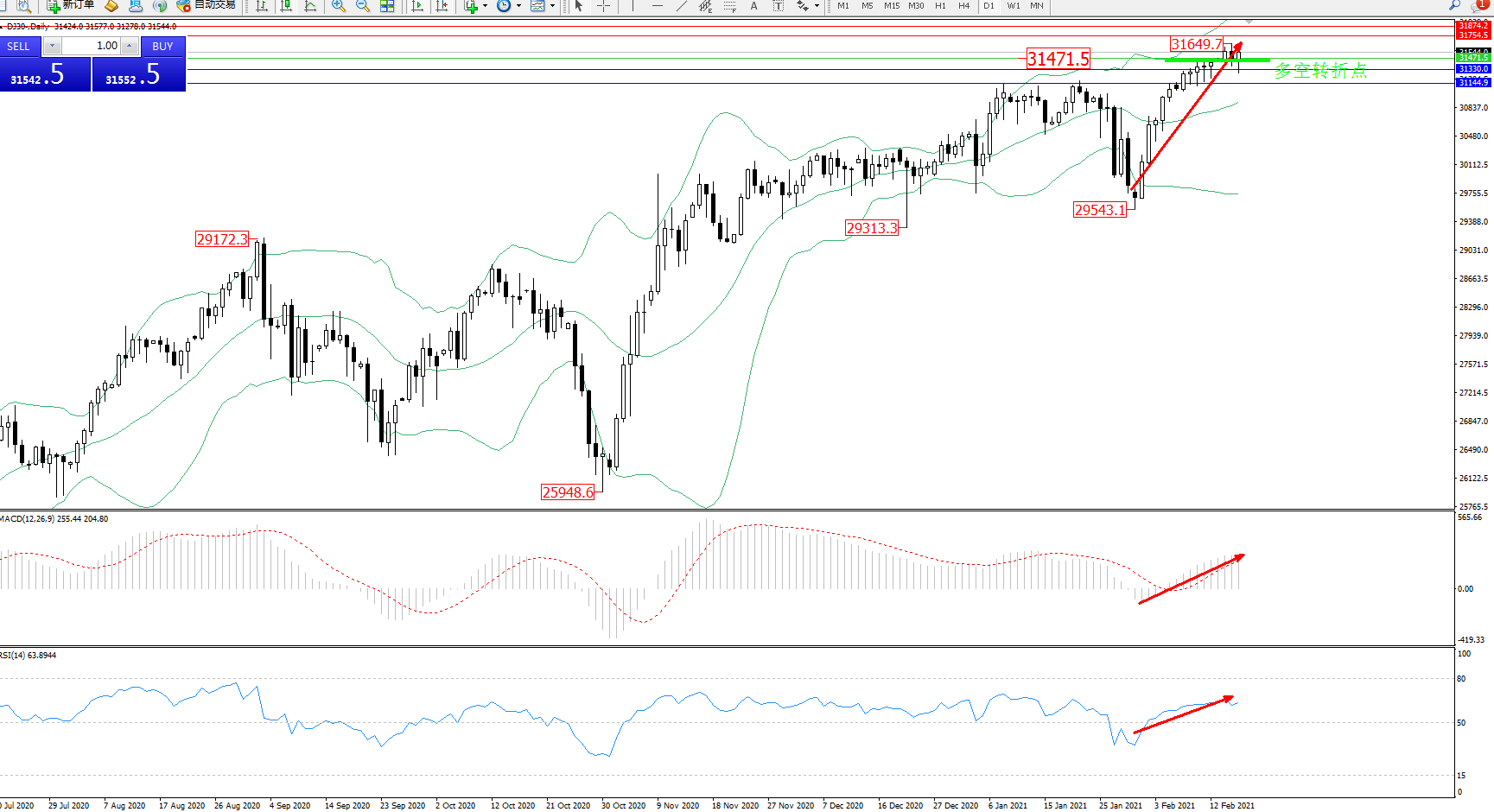 技术点评:高位呈V型反转态势强势拉升上扬,高位抵达31649附近节点徘徊中,处于布林带指标中上轨区间持续震荡,布林带指标呈缓慢张口走势持续中,多头动力有进一步上扬态势,MACD指标处于多头区域持续整理上移中,RSI指标处于多头区域维持持续徘徊上行中;