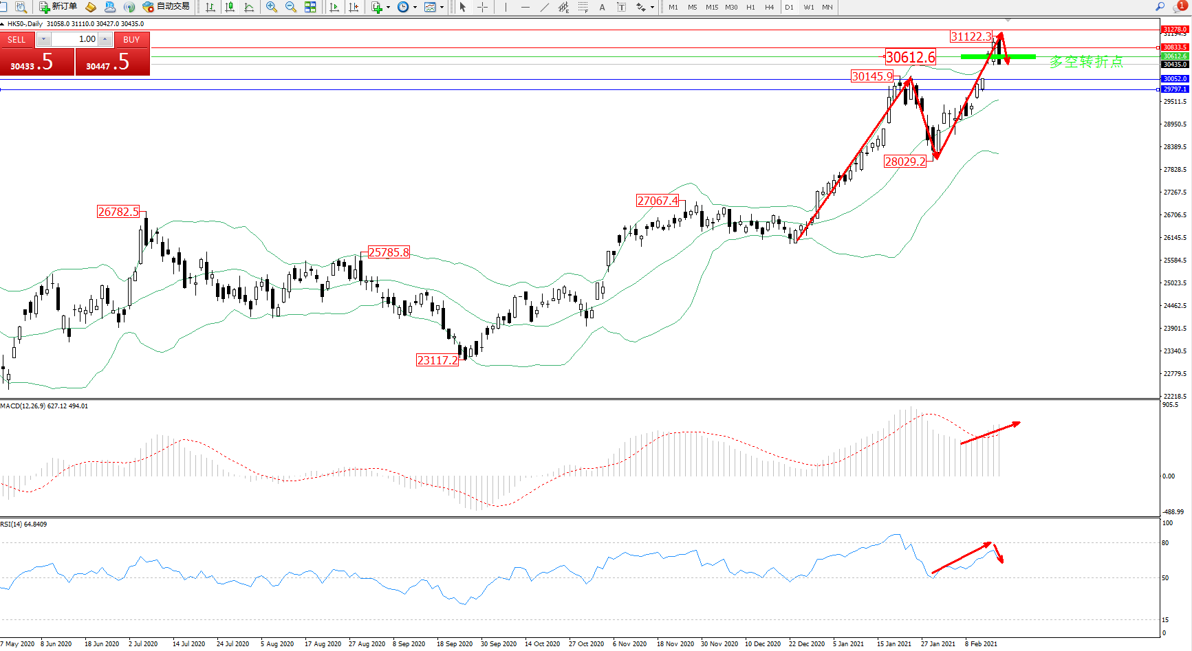 香港恒生指数2月18日(周四)收盘下跌489.67点,跌幅1.58%,报30595.27点;港股三大指数均呈单边下跌行情,A股牛年首日创业板大跌近3%。值得一提的是,A股未开市前港股前几日走牛,今日形成港A齐跌的格局。恒生科技指数跌3.23%报10591点。大型科技股美团大跌超5%,网易跌超3%,阿里巴巴、小米、腾讯均下跌;纸业股逆势大涨,晨鸣纸业飙升超19%,煤炭股、电信股、在线教育股炒起。新股诺辉健康上市首日收涨215%。今日港股通开市,南下资金逆势净流入近150亿港元,大市成交量明显放大至超2800亿港元。当前南向资金配置港股意愿仍旧强劲,看好港股的逻辑仍存,对港股市场的长期趋势仍然保持乐观。配置方面,可在新老经济之间进行均衡配置,港股独有的部分新兴标的可能会继续受到南向投资者的青睐。