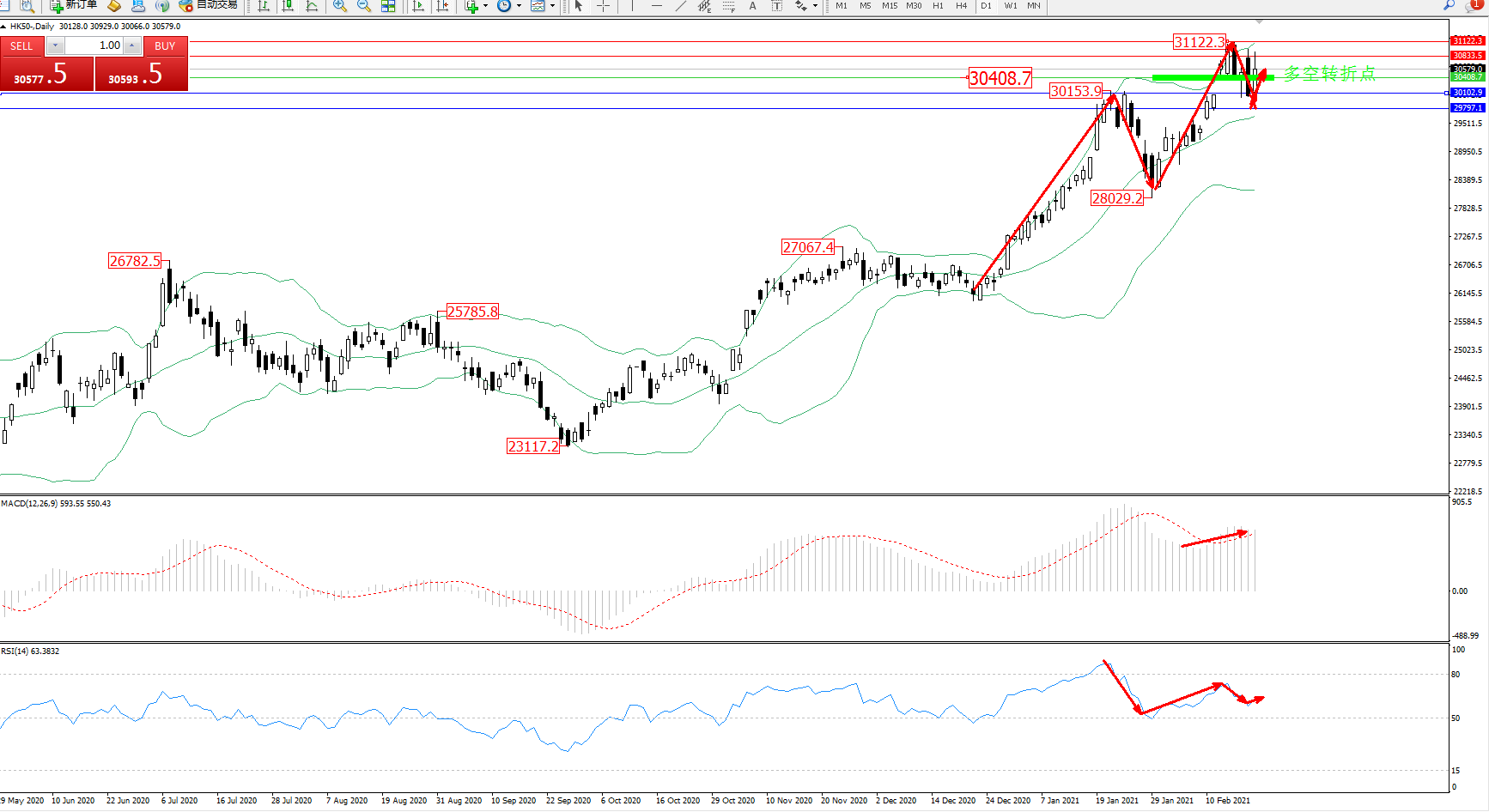 技术点评:多头动力延续布林带指标通道中上轨区间持续震荡上扬态势良好,高位抵达31122位置节点后开始宽幅整理平移中,布林带指标呈缓慢张口走势后持续中,关注中上轨区间关键节点,MACD指标处于多头区域维持整理平移中,RSI指标处于多头区域持续震荡回撤后有反转上移迹象;