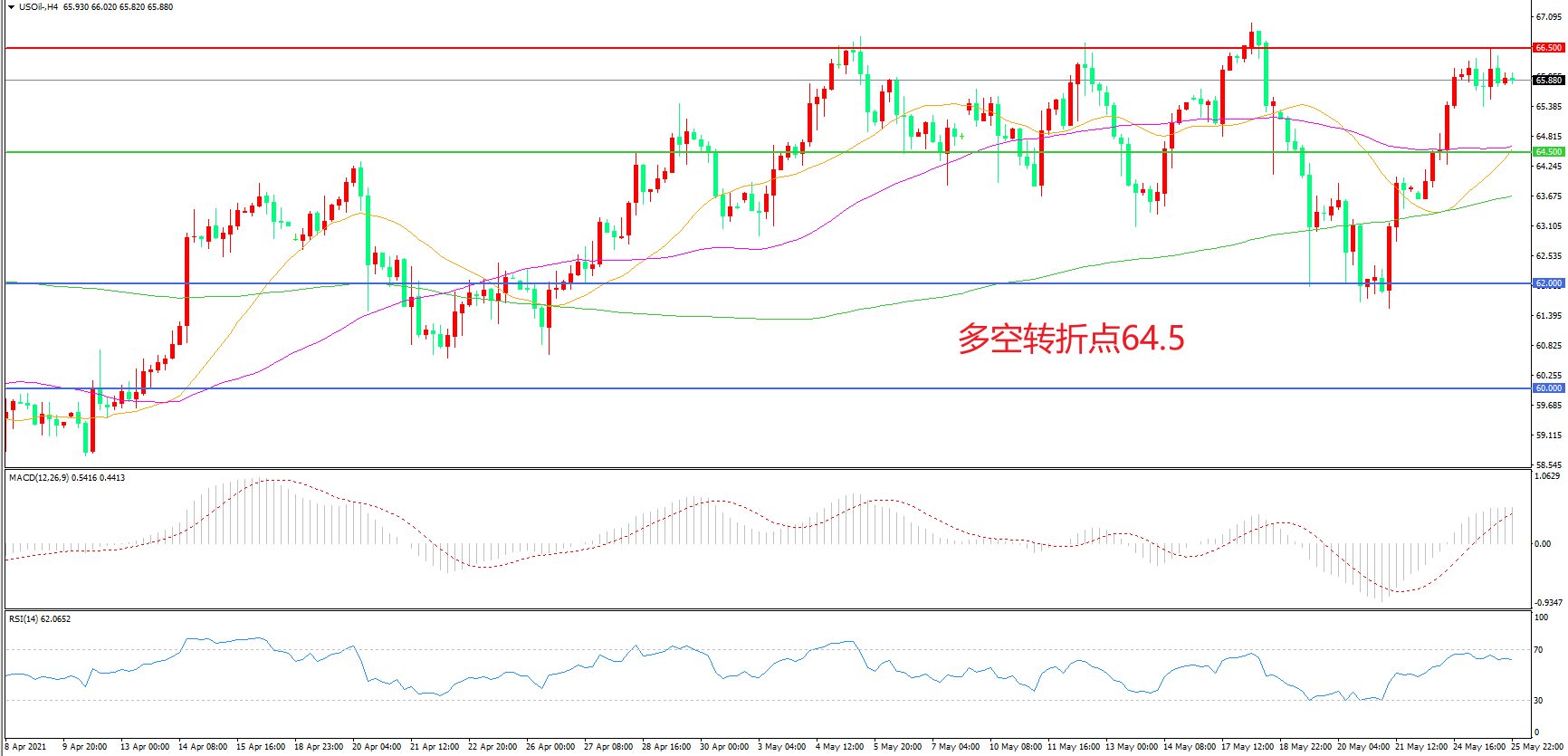 4小时图看,油价延续高位调整,区间震荡迹象较为明显,55周期均线成为下方支撑,66.5美元成为中期阻力,MACD红柱增加,RSI指标向上,日内震荡上行概率较大。
