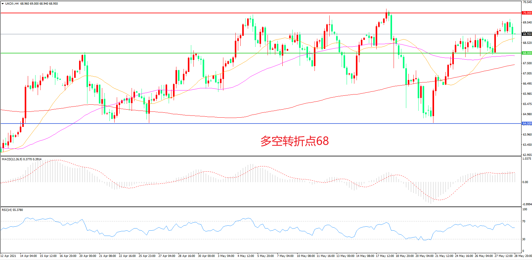 4小时图看,油价长阳拉升,突破前期整理区间,短期表现较为强势,21周期均线成为下方支撑,70美元成为中期阻力,MACD红柱增加,RSI指标走平,日内震荡上行概率较大。