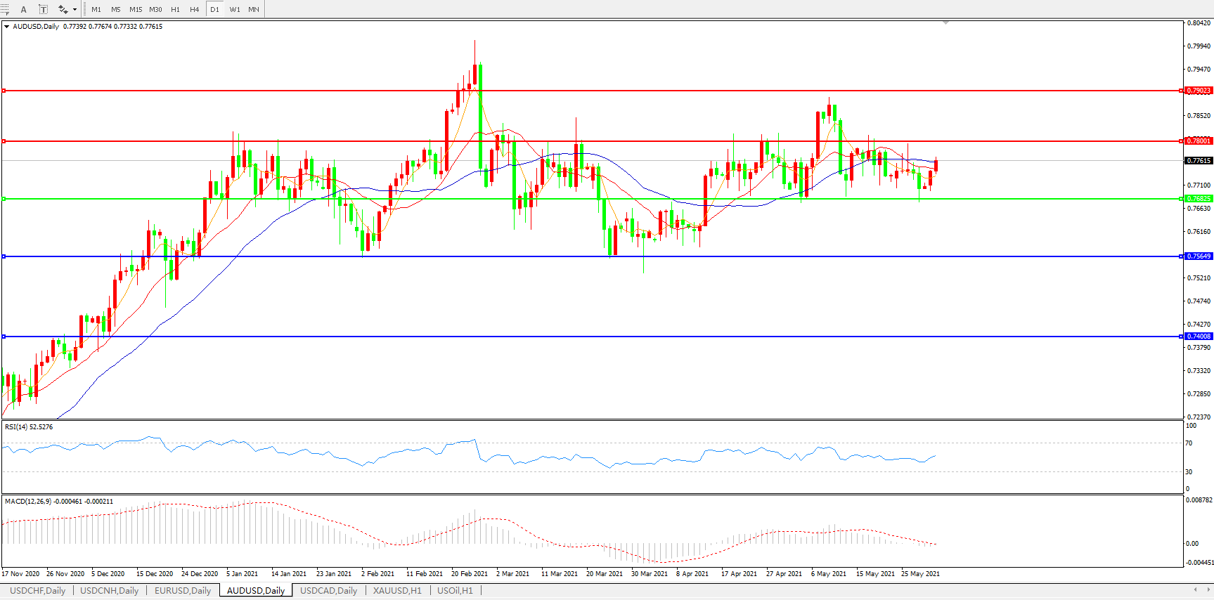 备选策略:0.7680下方看跌,目标0.7560、0.7400