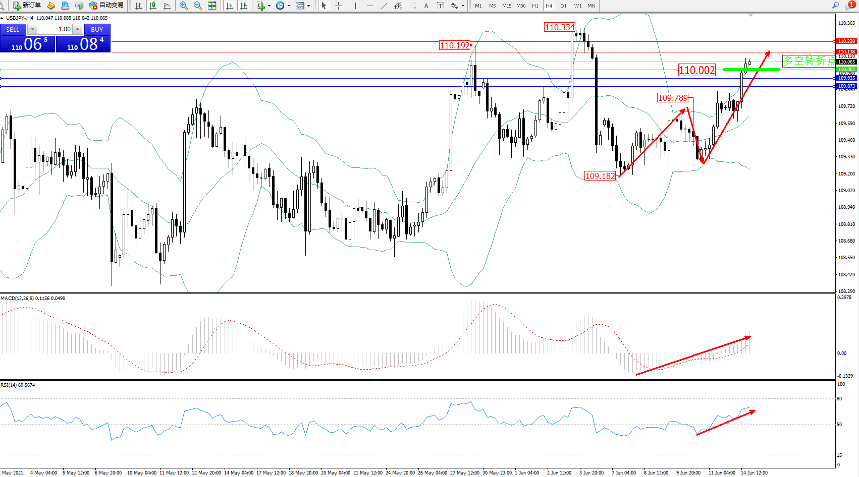 美元兑日圆强势拉升至110.065附近震荡,在本周美联储政策决议发布在即之际,市场对美联储未来逐步缩减购债力度这一进程的预期再起,这使得美元指数止跌回升。与此同时,在G7领导人峰会过后,市场对全球经济前景乐观情绪的进一步发酵,也使得避险资产承压,令美元兑日元觅得额外上行动能;市场风险情绪变化之下,美元与日元汇价仍保持大体同进同退的走势,而本周美联储与日本央行也将先后发布政策决议,但都料不会有根本性的政策方向变化,因此汇价仍将在区间内震荡盘整。