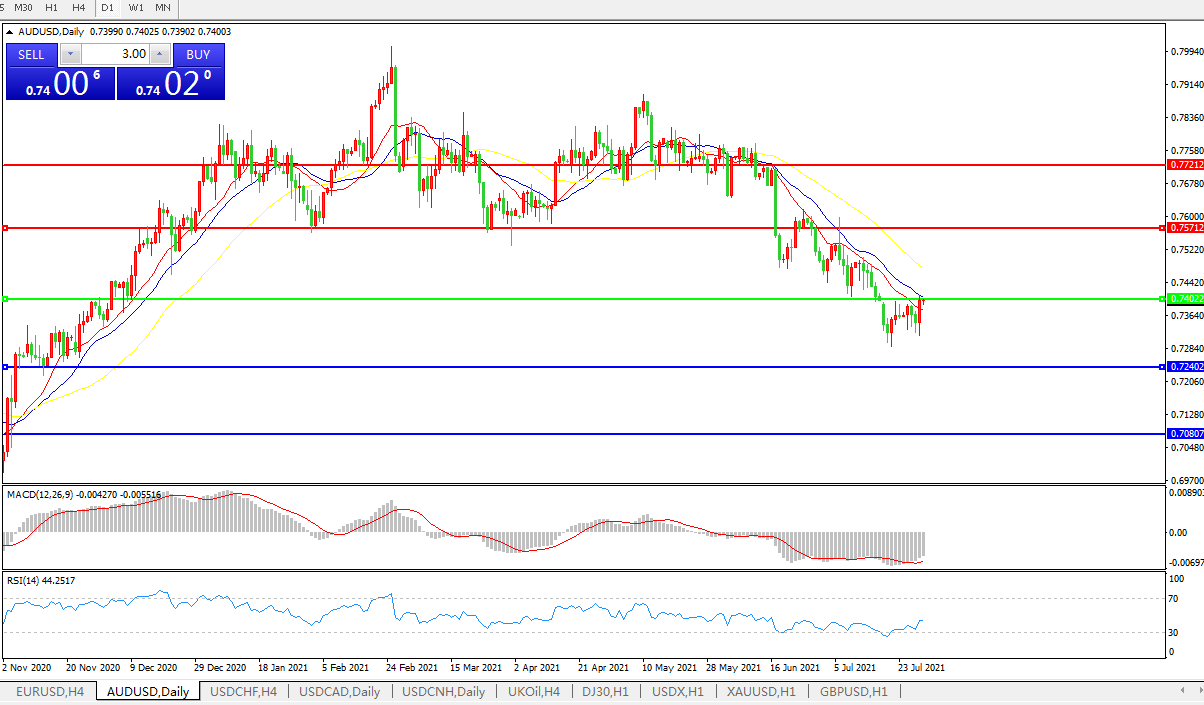 交易策略:0.7400下方看跌,目标0.7240、0.7080