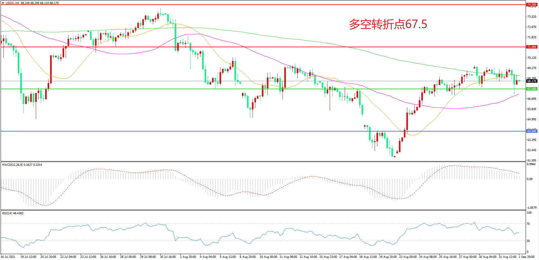周三(9月1日),以沙特和俄罗斯为首的OPEC+会议不到半小时,各国石油部长便达成统一意见,坚持增产原计划,消息一出,油价掉头大跌,但 EIA库存降幅超过预期提振了多头信心,美国WTI原油“惊险”回升,收报68.18美元/桶。就目前来看,市场的利多几乎已经反应完毕,一旦有利空消息出现,价格很有可能会向下砸盘,短线追高需要保持谨慎。
