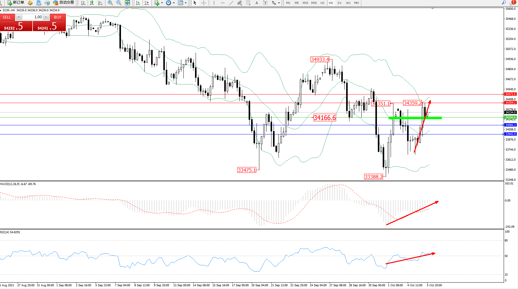 道琼斯指数DJ30——4小时K线图显示: