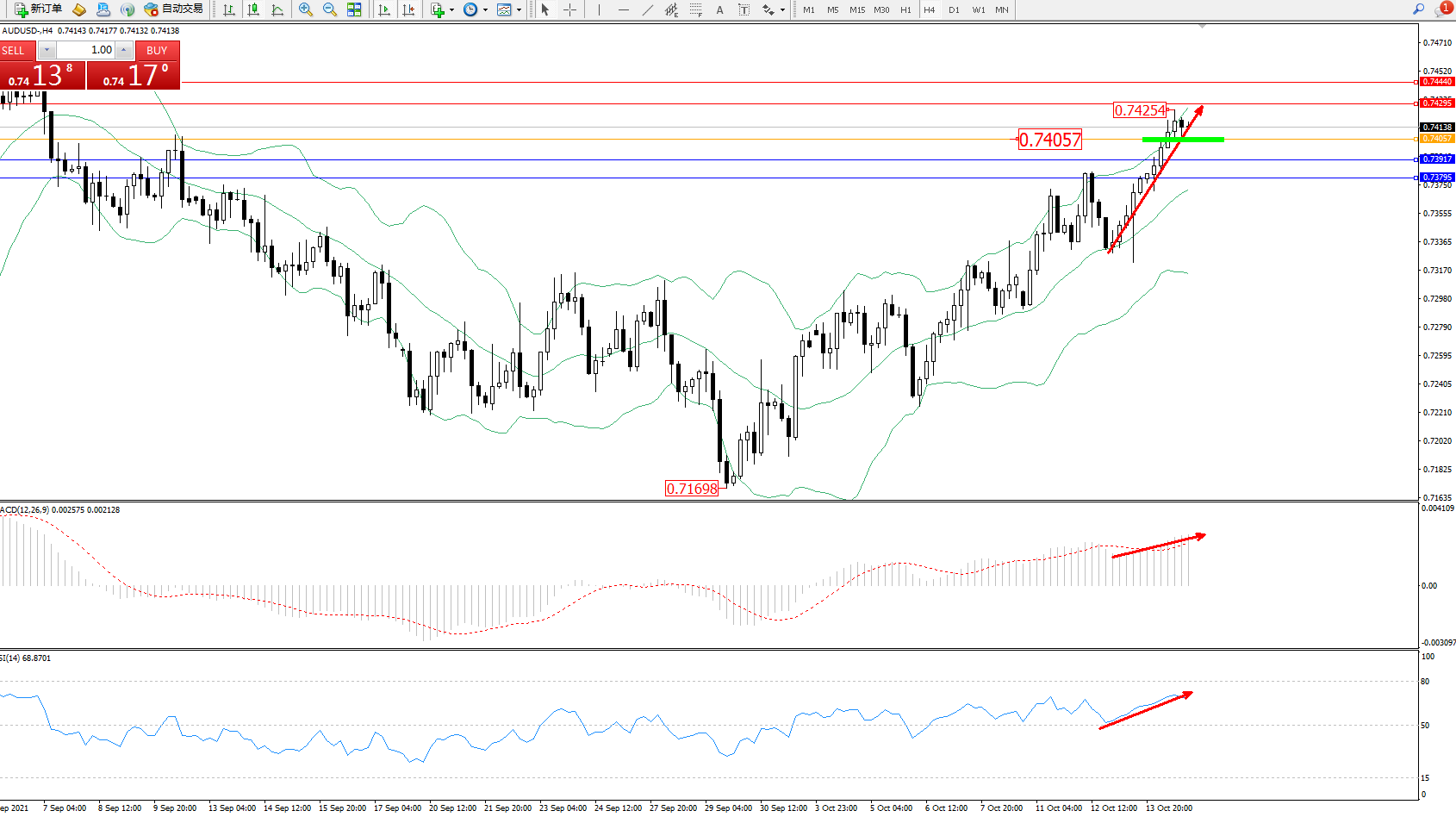 交易策略:0.74057上方看涨,目标0.74295、0.74440
