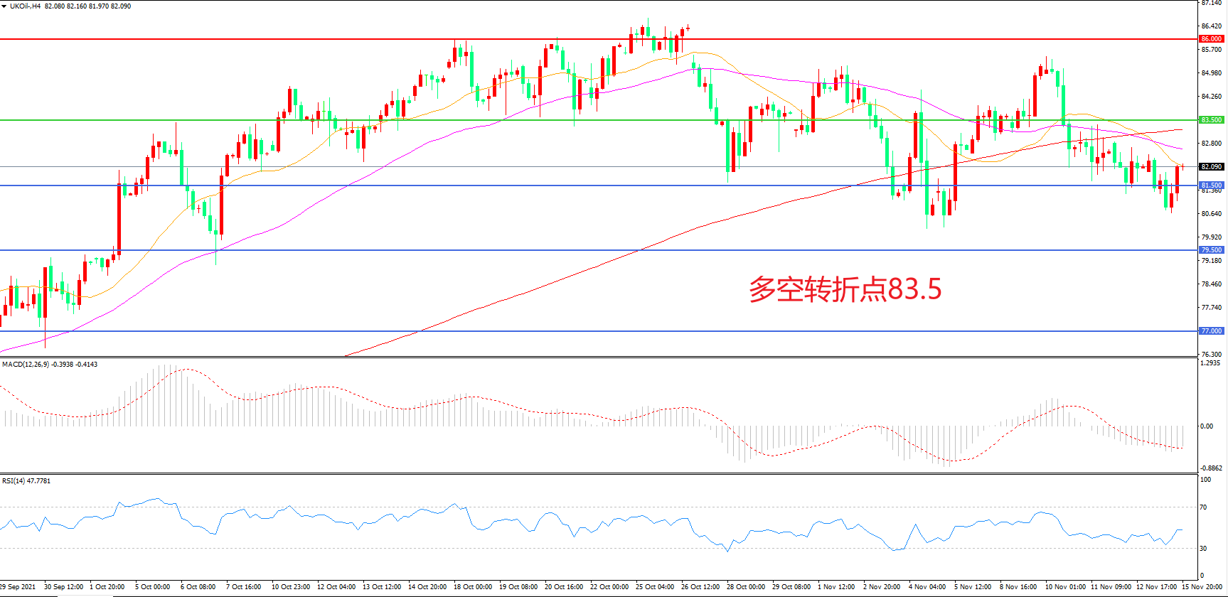 4小时图看,油价受制于均线压力震荡下行,整体表现偏空,83.5美元成为上方阻力,81.5美元成为短期支撑,MACD绿柱缩短,RSI指标走平,日内震荡下行概率较大。