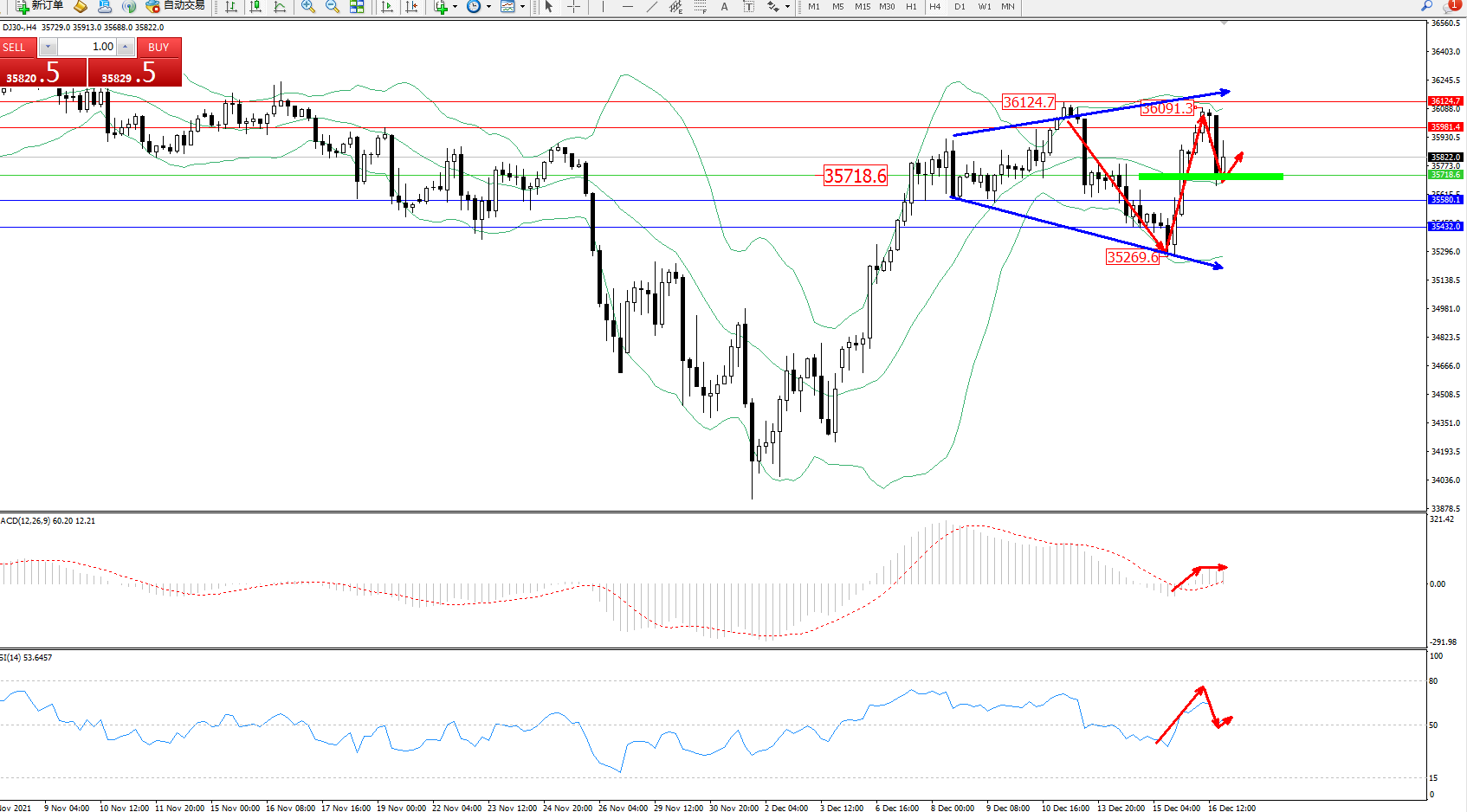 道琼斯指数DJ30——4小时K线图显示: