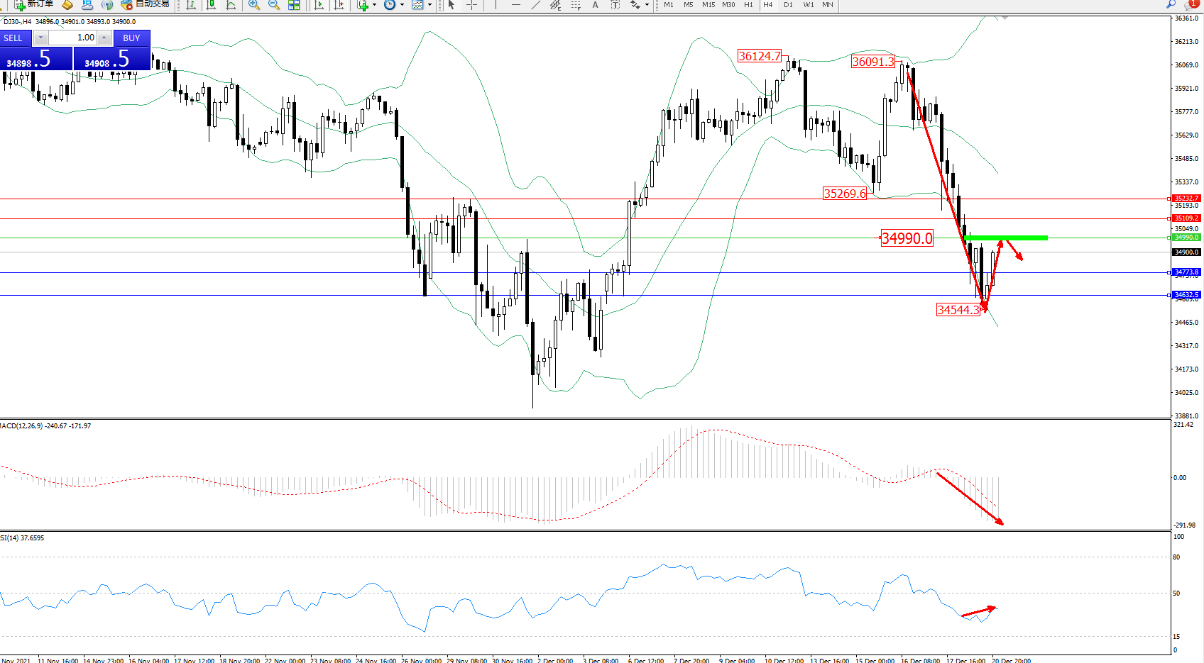 道琼斯指数DJ30——4小时K线图显示: