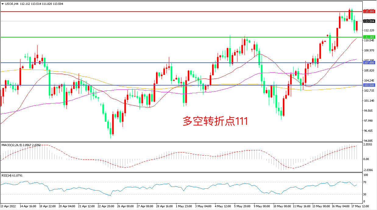 周二(5月16日),沙特能源部长萨勒曼在巴林的一次能源会议中表示,目前炼油能力不足,单靠增产解决不了问题,美国WTI原油触及上方阻力后回落,收报113.50美元/桶。目前美国国内油品供应紧张局面进一步推动了市场的看涨情绪,这也让资金敢于在关键的高位区间上沿附近继续推涨油价,但考虑到目前原油市场的复杂环境,高位震荡格局很难改变。