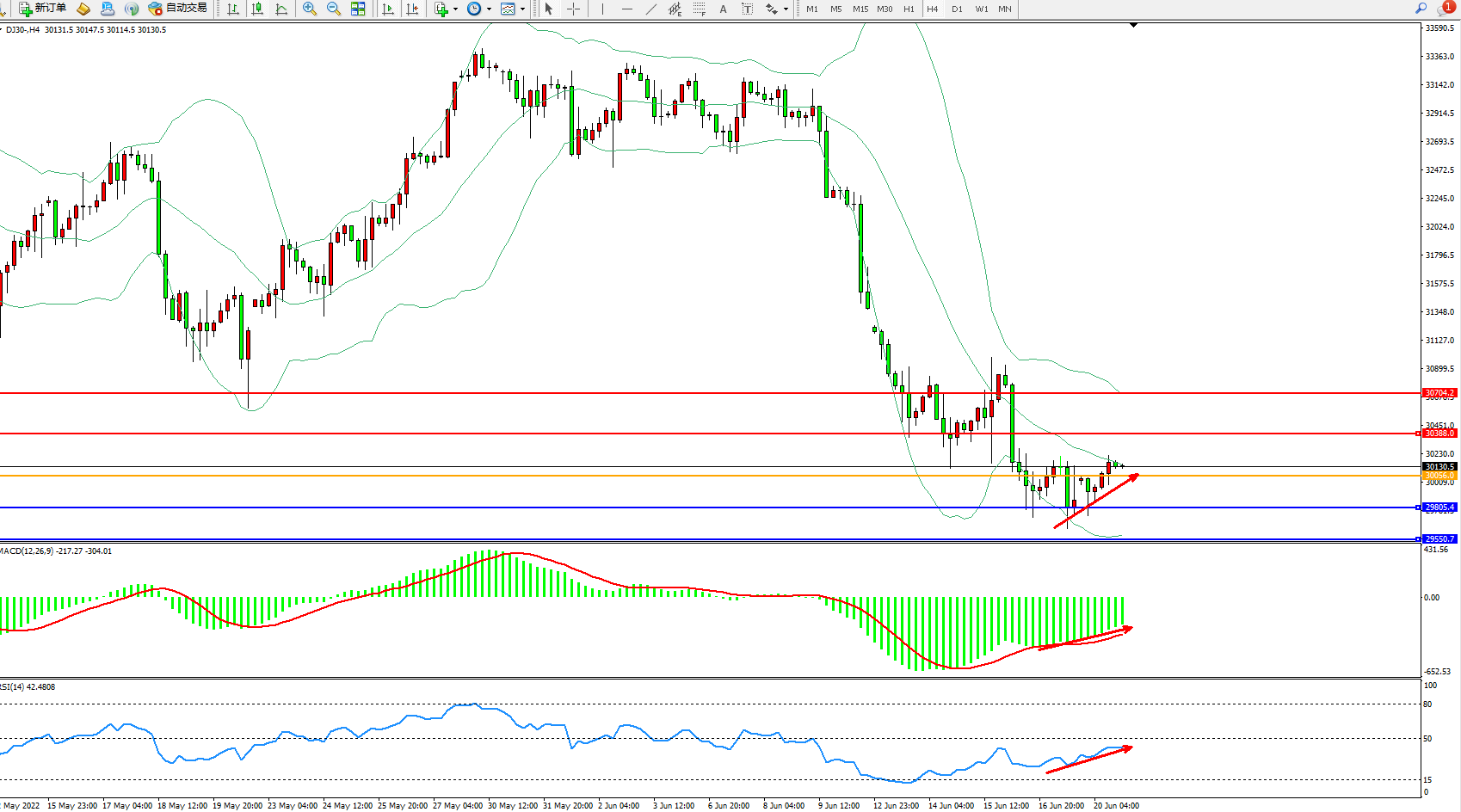 道琼斯指数DJ30——4小时K线图显示: