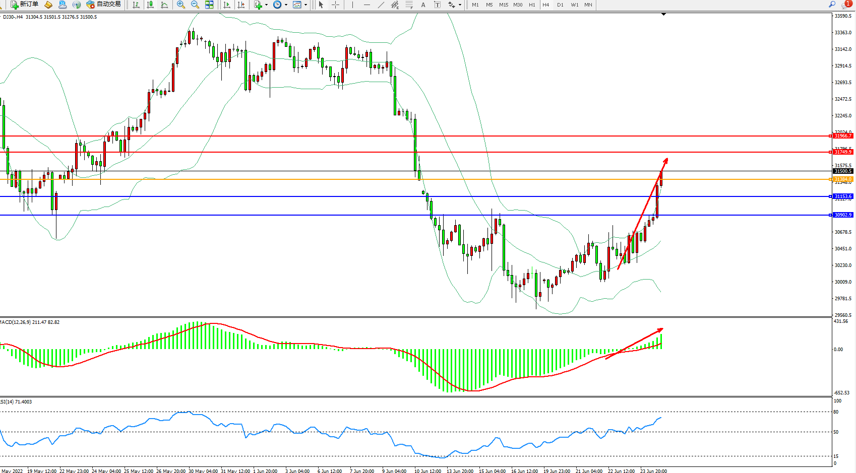 道琼斯指数DJ30——4小时K线图显示: