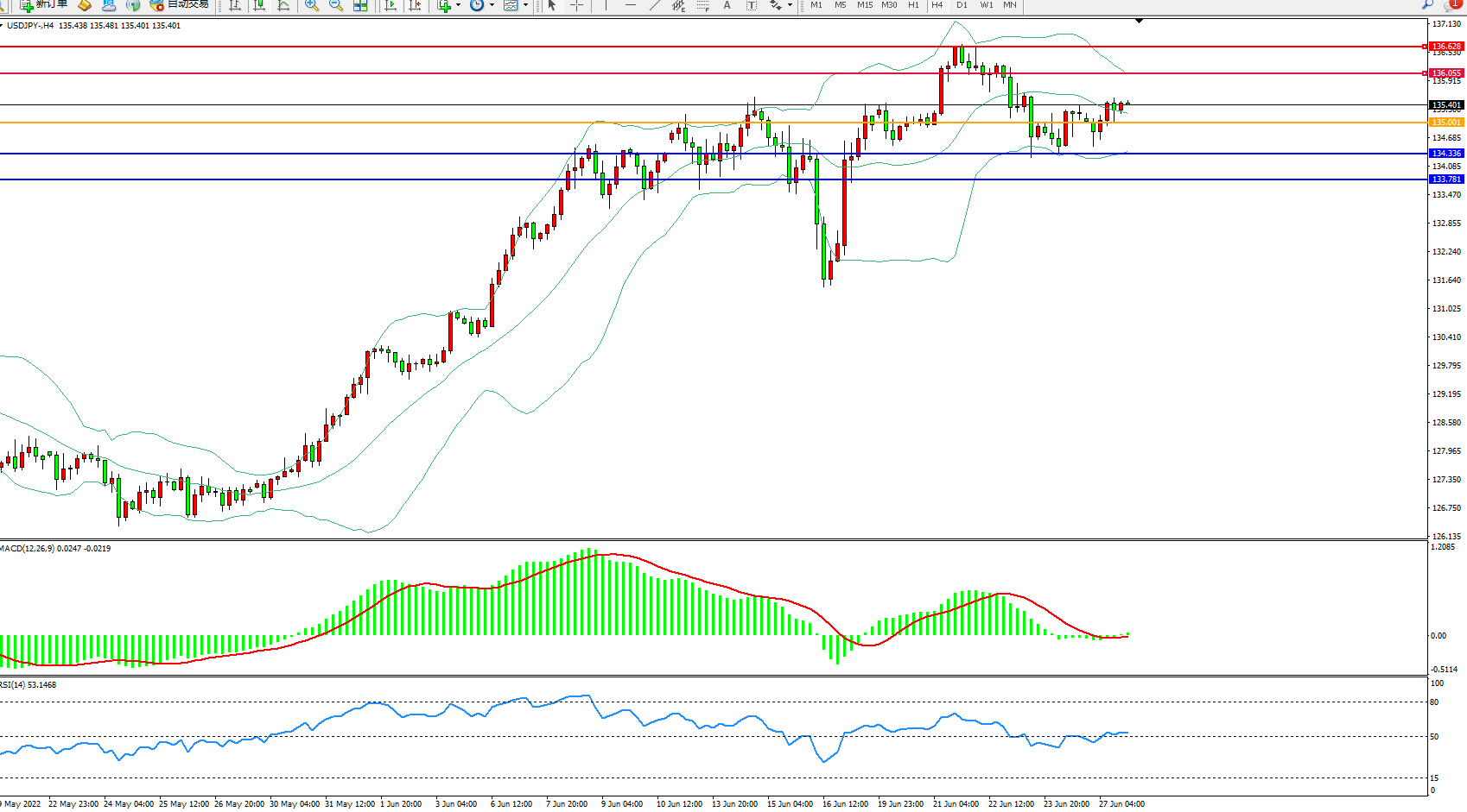 交易策略:135.001上方看涨,目标136.055、136.628