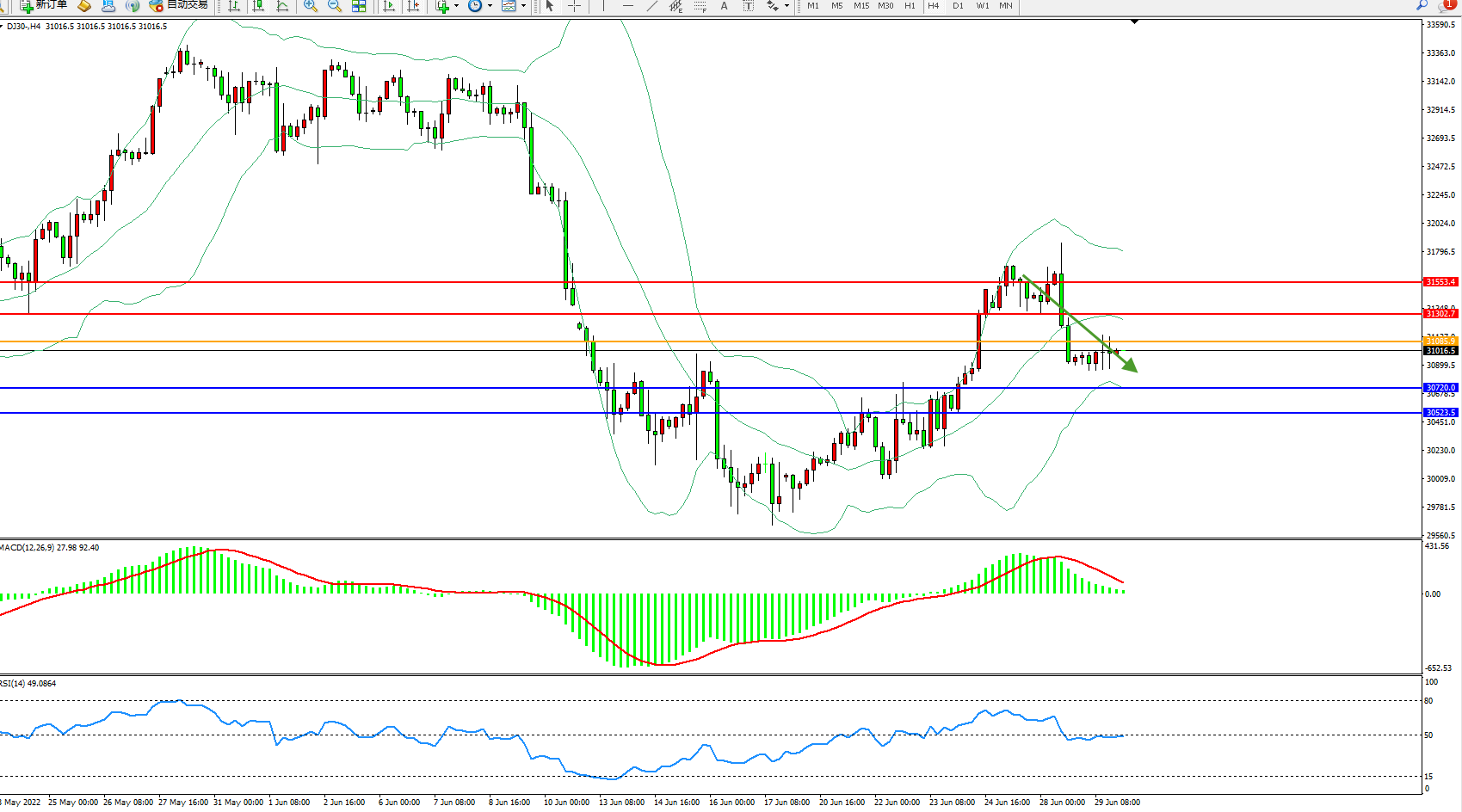 道琼斯指数DJ30——4小时K线图显示: