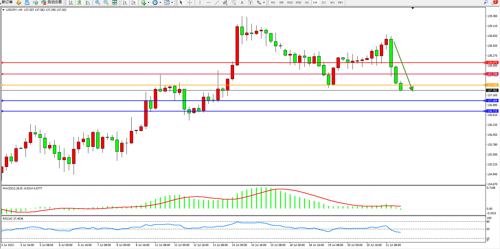 4小时图看:短期处于高位震荡缓慢上移,高位遇阻回撤,空头动力伺机入场急速下挫,MACD指标处于0轴线附近弱势徘徊,RSI指标处于50均衡线下侧窄幅整理中;