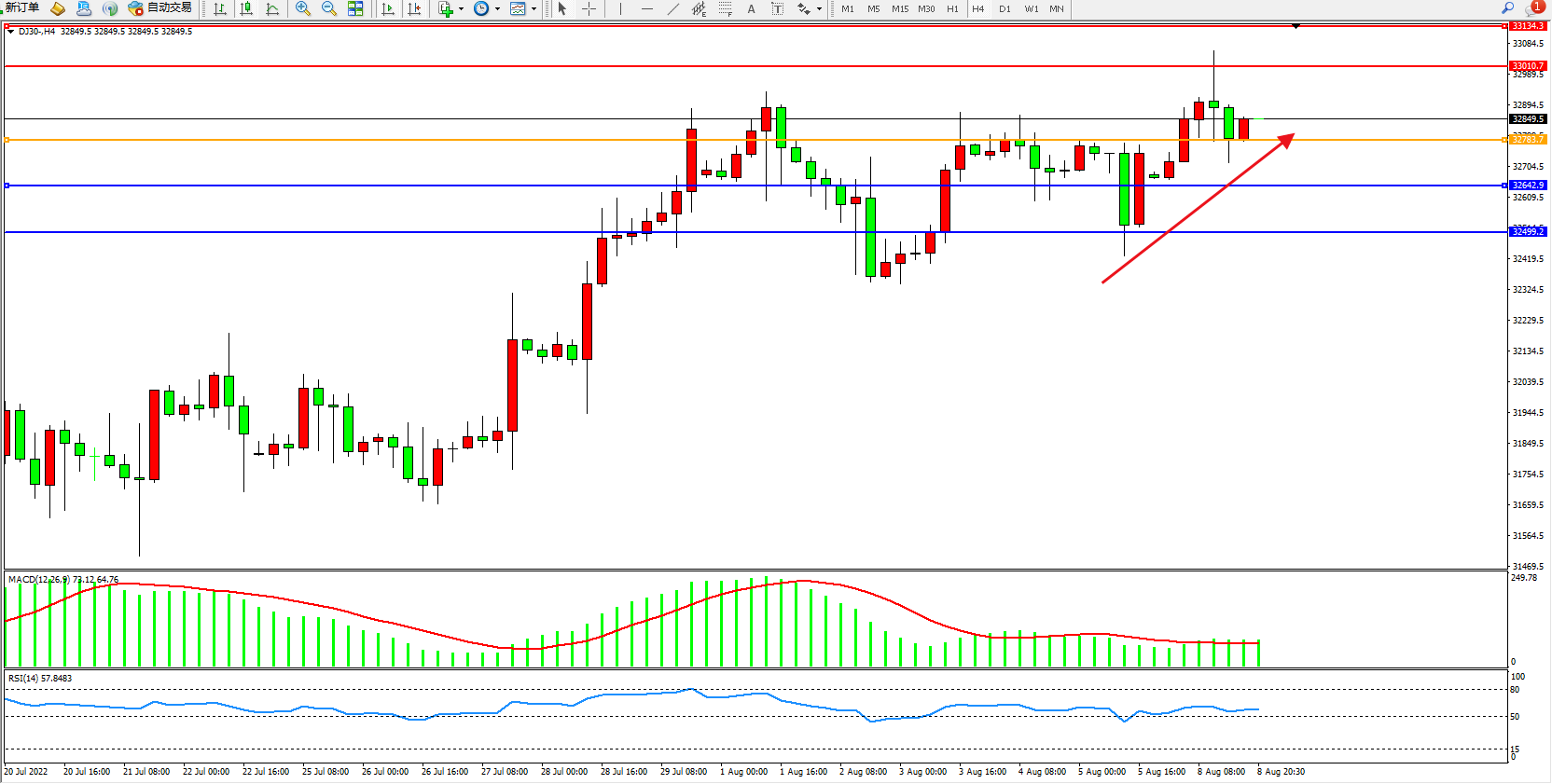 道琼斯指数DJ30——4小时K线图显示: