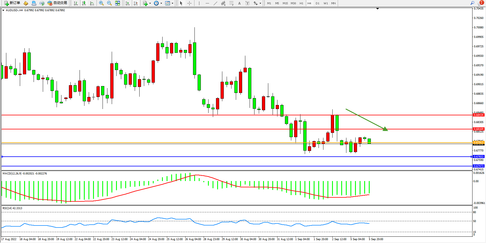 交易策略:0.67913下方看跌,目标0.67653、0.67473