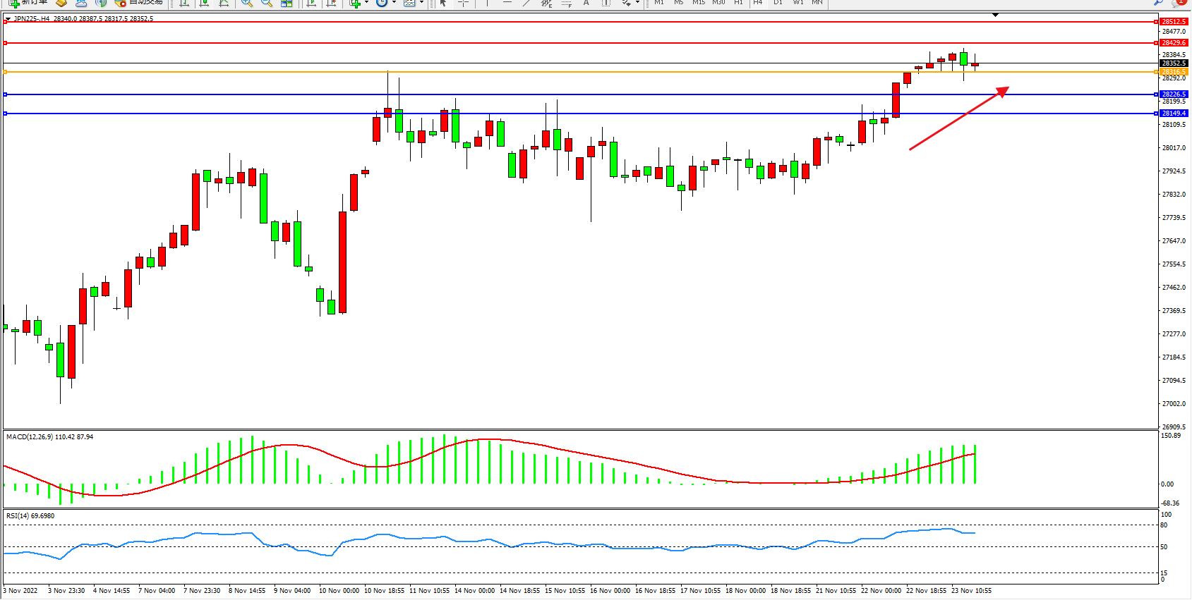 日经指数JPN225——4小时K线图显示: