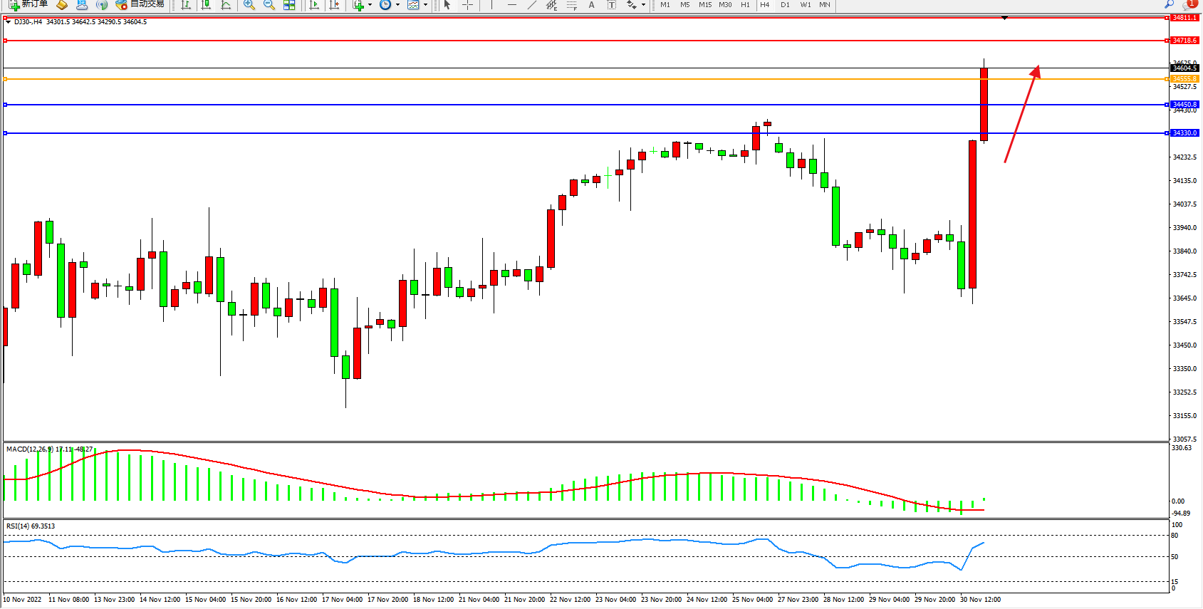 道琼斯指数DJ30——4小时K线图显示: