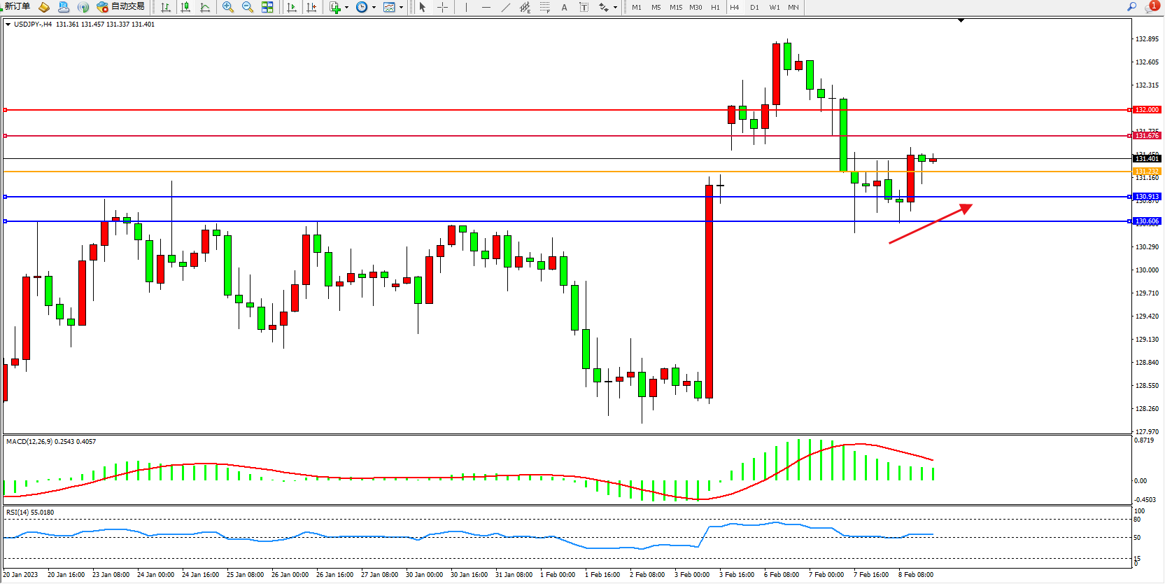 交易策略:131.232上方看涨,目标131.676、132.000