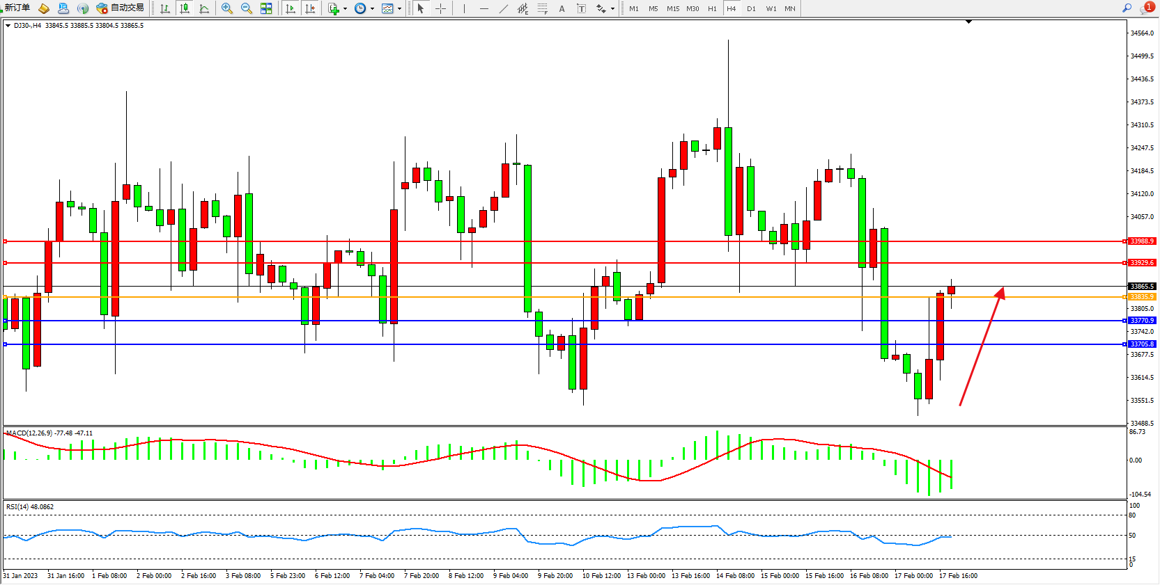 道琼斯指数DJ30——4小时K线图显示: