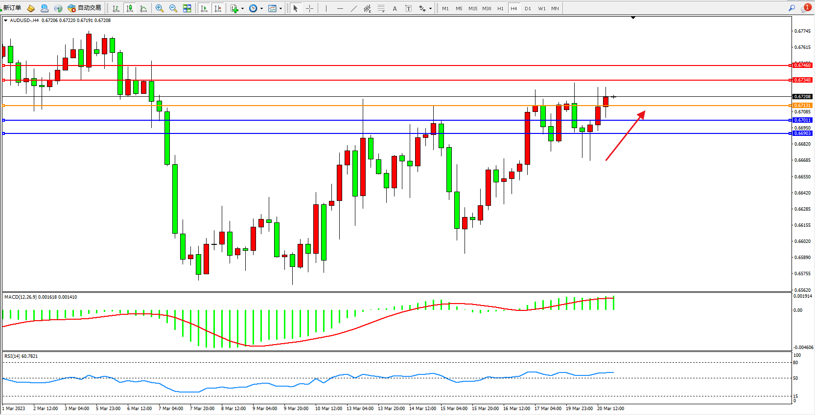 交易策略:0.67131上方看涨,目标0.67340  0.67460
