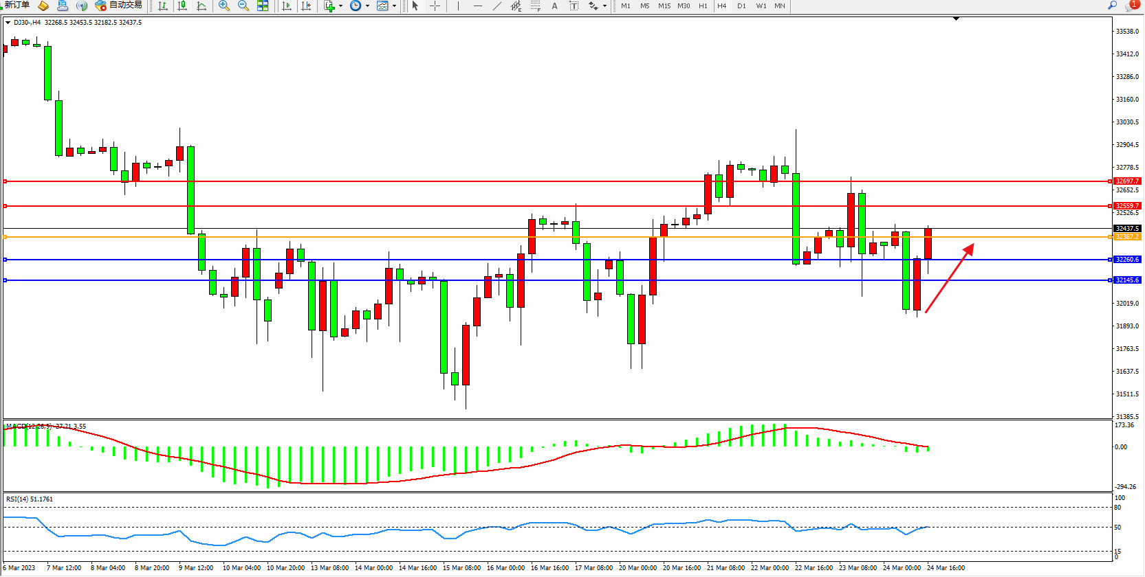 道琼斯指数DJ30——4小时K线图显示:
