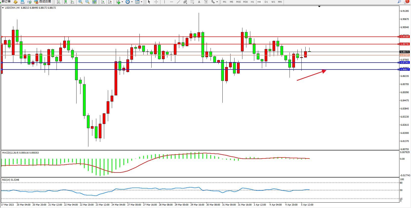 4小时图看:短期高位宽幅震荡,市场多头动力开始缓慢涌现,有继续向上移动迹象,MACD指标处于0轴线附近弱势徘徊,RSI指标处于50均衡线附近弱势整理;